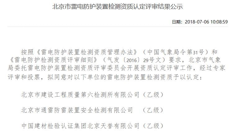 6月23日,北京市防雷防护装置检测资质认定评审工作在中国建材检验认证集团北京天誉有限公司展开。经过公司经营状况和现场检测操作两项严格考评,我公司的防雷检测能力水平得到专家组一致认可。通过评审和投票,专家组最终对我公司的雷电防护装置检测资质予以认定。7月6日,资质认定评审结果在北京市气象局网站公示。